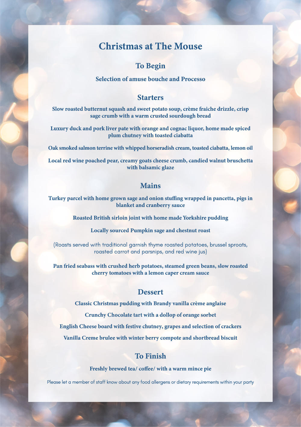(v) = Vegetarian | (gf) = Gluten Free | (ve) = Vegan | Please ask a member of staff for food allergen advice